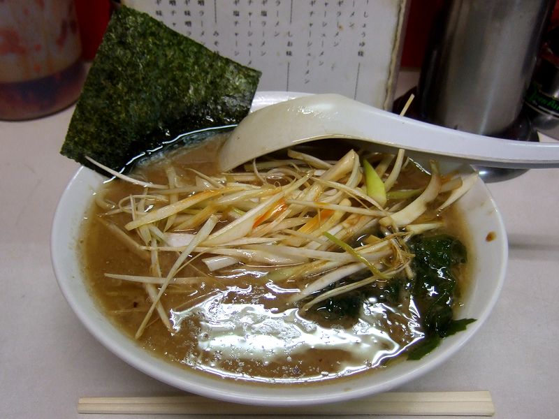 そんなわけで、前橋市内から暫く走り、その国道50号が片側2車線になってちょっと行ったところに、お目当てのお店はありました。そこからちょっと離れた(前橋方面からだとょっと通り過ぎたところに)ある駐車場にクルマを停め入店。店内は、贔屓目に見てもあまり清潔とは言い難く、いかにも、昔からある『ラーメン屋』といった風情。もっとも、昔からラーメン屋は店が汚いほうが旨いなんて言いますので、個人的には期待が高まってまいりました。そしてカウンターに座りお品書きを見たところ、某ラーメン本に載っていた『特濃』というメニューが見あたりません。壁に貼られたお品書きが2つほど裏返してあり、どうやらそれがその特濃っぽかったのですが、今日は無理なようなので、とりあえず普通のネギラーメンをお願い。目の前で作られるのを見ながら待つこと少しで登場しました。