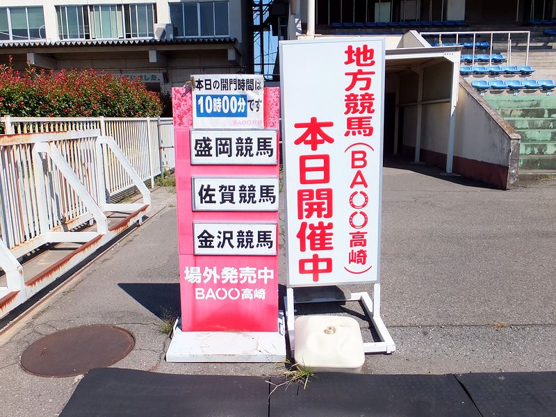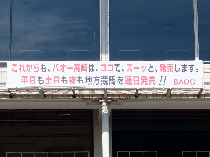 その後、平成17年(2005年)3月までは、群馬県競馬組合が地方競馬馬券の場外発売を実施していましたが、4月1日からはBAOO高崎(株式会社日本レーシングサービスが運営)に変更となりました。また、JRAについては、高崎競馬場が現役の頃から高崎場外発売所~ウインズ高崎として馬券の場外発売業務を行ってきましたが、平成26年6月に終了となってしまいました。