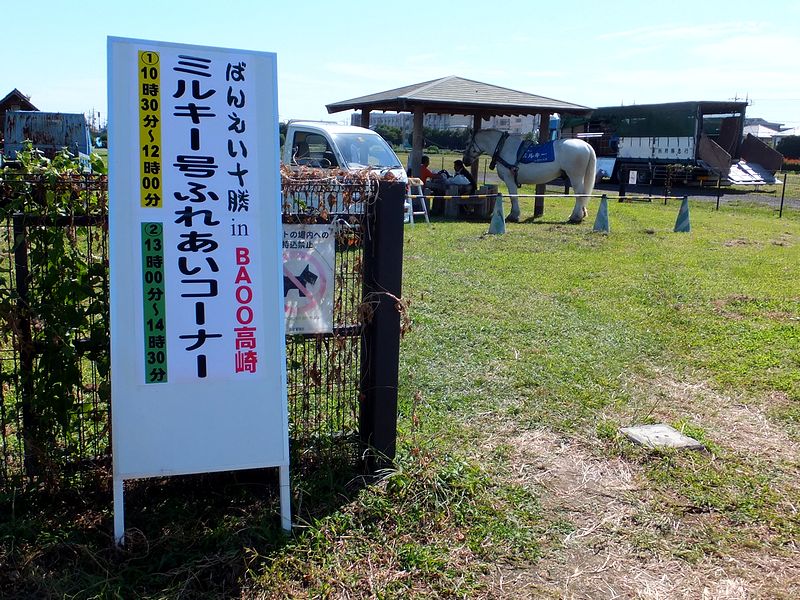 そのBAOO高崎ですが、是非一度行ってみたいと思っていたところ、(平成26年)9月20・21日に『ばんえい十勝 in BAOO高崎2014』 ~ばん馬が高崎場外にやってくる!~というイベントが行われるのを相方が発見。特に21日は、ばんえい競馬PR馬のミルキー号もやってくるとのこと。丁度21日は特段予定がなかったこともあり、これを機会にお伺いしてみることにしました。