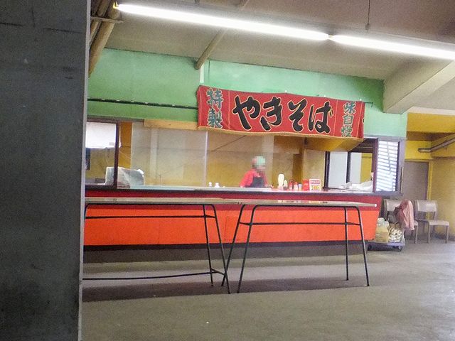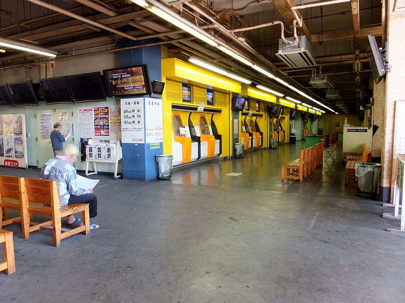 専門紙片手に、先程はクルマで場内に直接入ってしまったので通らなかった正面入口を改めて一度出てから入場。なんていうか、正面入口から入らないと、何かしっくりこないんですよね。で、改めて見ると、正面入口の建物やスタンド建物の高い部分の向かって右側のJRA表記のあった部分は全て塗りつぶされていました。それと(当たり前ですが)高崎競馬場の面影が色濃く残っているのがノスタルジーを感じさせ、嬉しいやら悲しいやら。ただ、馬券の発売・払い戻し機のまわりが明るい色で塗られているのは、気持ち的に明るくなってとても良いと思いました。それから、ベンチが多数置いてあるのも、主な利用者を考えると良いですね。(私も大変有り難かったです。)あと、場内には、後述する飲食売店が2軒の他、清涼飲料水の自販機がわりと多めに。ちなみにアルコール類は無いようでしたが、確か高崎競馬場時代から場内じゃ売っていなかったかと。