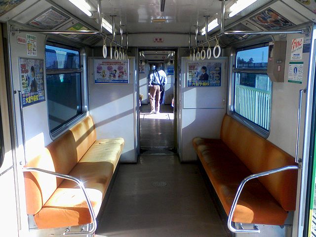 先頭車両に、車両中央に一つしかない両開きドアから乗車すると、座席がポツポツと埋まり、若干の立ち客が出る程度。それにしても、かわいらしい車両ですね。かぶりつきの場所は子供に譲り、ドア付近に立って、前方を眺めることにします。