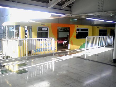 ほどなくして、軌道に向かって右手方向より列車が入線。入ってきた列車は、黄と緑に塗り分けられた1010系6両編成。ニューシャトルといえば赤と白の塗り分けというイメージだったのですが、現在はこの塗色に塗り替えられているようです。また、ニューシャトルには、1010系、1050系、2000系の3種類の車両があるのですが、その中で一番古い開業当初からの車両が1010系(開業当初は1000系と称したらしい)です。