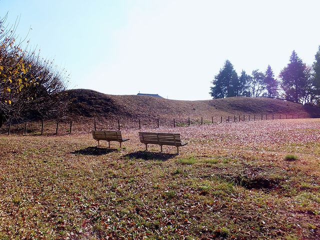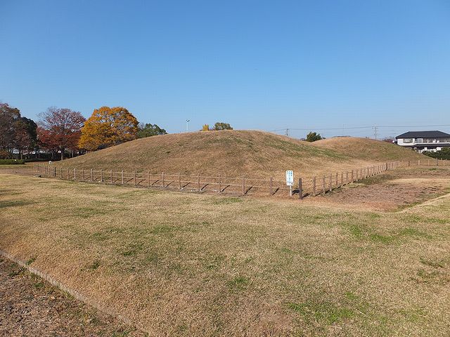 古墳群の南端にあるうちのもう1つが、中の山古墳。二重周堀(現在は完全に埋まっている)を持つ全長79mの前方後円墳で、築造は6世紀末から7世紀初めと考えられています。またここからは他の古墳のような埴輪ではなく、須恵質埴輪壺(すえしつはにわつぼ)という珍しい土器が出土したとのこと。