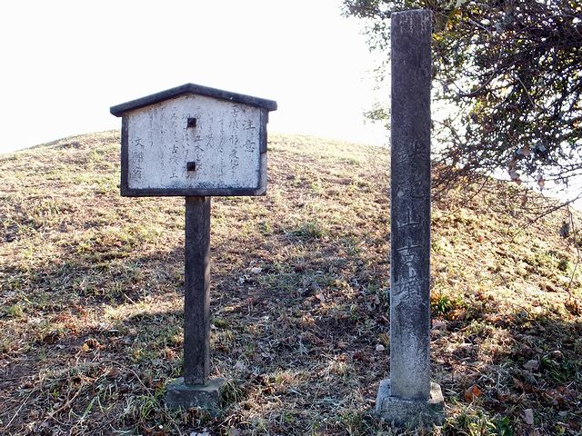 【鉄砲山古墳の石碑と石で出来た注意書き看板】