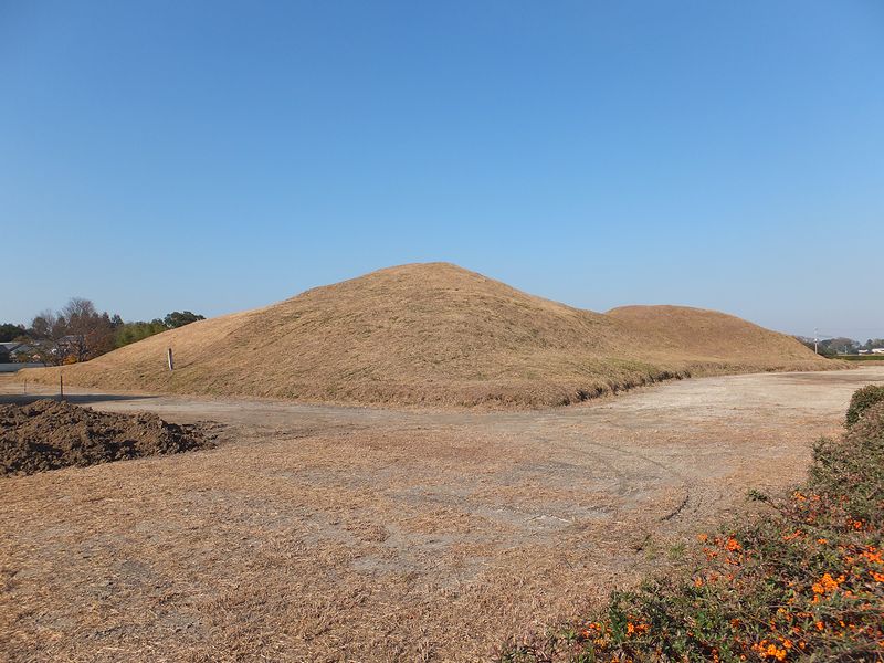 先の4つがあったエリアから、道路を渡って駐車場なんかがあるエリアに来て最初に見たのが、旧武蔵国最大の古墳である双子山古墳で、かつては観音寺山とも呼ばれていたそう。二重周堀を持つ全長138mの前方後円墳で、築造は6世紀初頭前後と考えられています。また同じ埼玉古墳群にある稲荷山古墳とは築造時期が近く、古墳の形状や向きも一緒と共通性があるとのこと。で、訪れた時は整備工事が行われている影響か内堀に水がほとんど無かったのですが、元々こちらの堀は空堀だったとのこと。