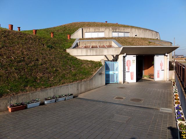 博物館に一番近い=最初に見たのが、瓦塚古墳。全長73mの前方後円墳で、築造は6世紀前半頃と考えられているそうで。またかつては、埼玉古墳群の特徴である長方形で二重の周堀(しゅうぼり)に囲まれていて(現在は一部のみ砂利で復元)、墳丘や中堤には様々な種類の埴輪が並べられていたのですが、その中の円柱状の太い柱を表現した家形埴輪は全国的にも珍しいものとのこと。