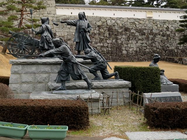 駐車場から入口の箕輪門を目指す途中にあったのが、城内への要衝である大壇口で戦う二本松少年隊と我が子の出陣服に肩印を縫い付ける母親を表したという二本松少年隊群像。またその以後は千人溜(せんにんだめ)と呼ばれた藩兵の集合場所で、少年隊士もここから持ち場に出陣したそうです。
