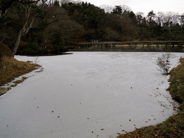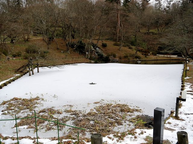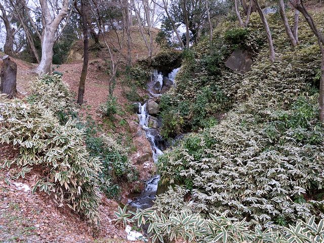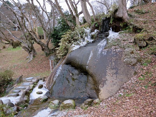 三の丸の西南方向から山の中腹に掛けて、回遊式の庭園が造られています。で、その中にある洗心亭という茶亭は、城内唯一の江戸時代の建造物で、もともとは城内に建立された「墨絵の御茶屋」と呼ばれた茶亭を天保8年(1837年)に阿武隈川河畔に移築し藩主の釣茶屋として利用。そしてそれを明治40年(1907年)、元の所在地とみられる現在地に再移築されたものです。他にも、推定樹齢300年という笠松等が植えられ、また池や滝がいくつか造られているのですが、その池や滝の水源は、城の防御などを目的として丹羽氏自体の初期に、安達太良山麓の湧水から18kmもの水路(二合田用水)を築いて引き込んだものです。