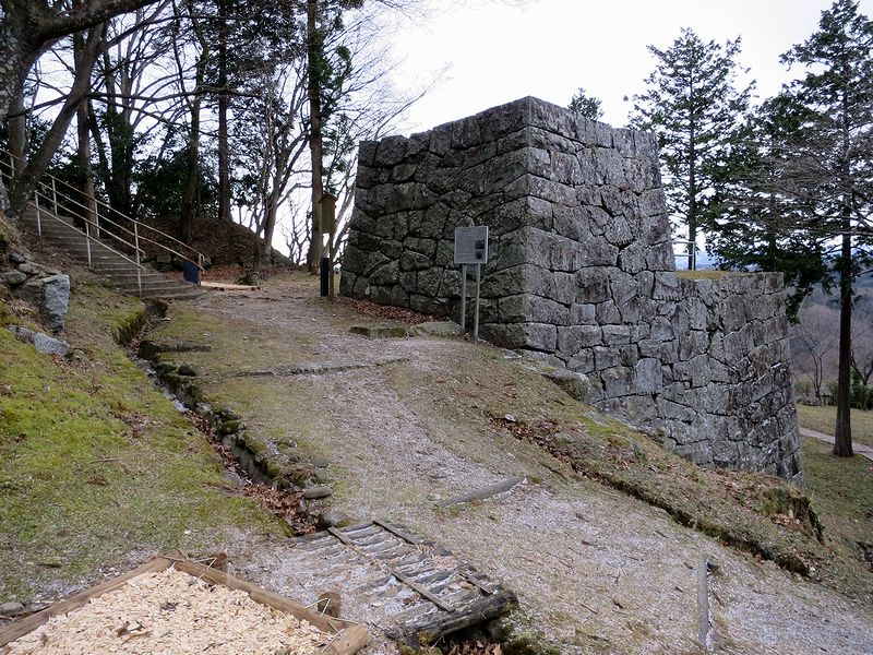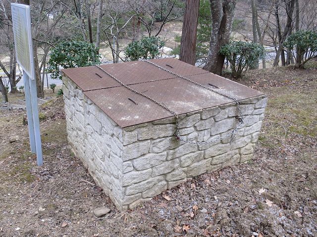 本丸北西側で本丸からだいぶ下のところにある曲輪にあるのがとっくり井戸。安全の為か蓋が掛けられ、中が見られないようになっていましたが、入口より内部が広いとっくりのような形状なのでその名が付いたとのことで、石組の状況から慶長期(1596~1614)の築造と考えられています。また、この井戸のある曲輪は、畠山氏の時代には熊野権現が祀られ権現丸と呼ばれていたのですが、慶長期には武家屋敷となっていたそうで。