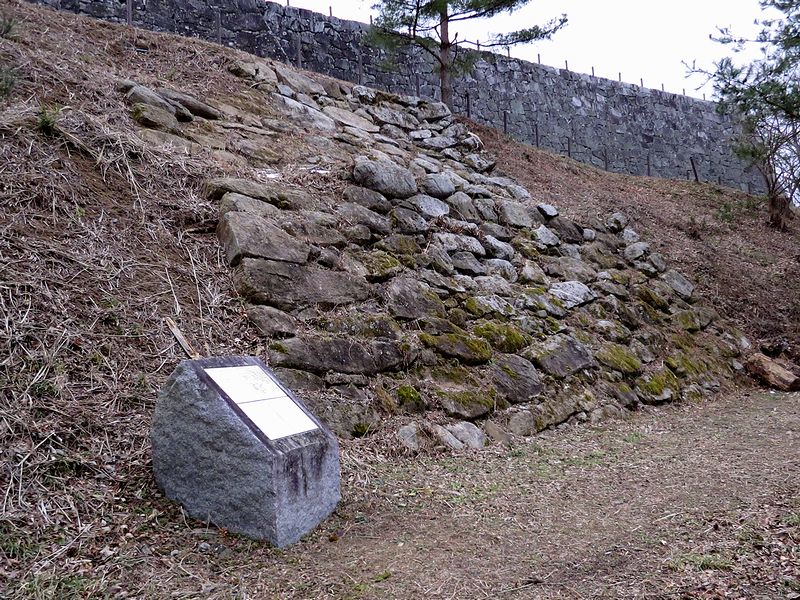 本丸すぐ下の西側斜面にあるのが、途中に犬走り様の段差を持った二段石垣と呼ばれる石垣。二本松城最古の石垣の一つで、蒲生氏郷に抱えられた穴太衆の手による、布積み崩しという積み方で組まれているそうです。