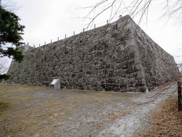 お城のある白旗ケ峯の頂上付近に聳え立つのが、本丸の石垣。もともと慶長年間(1596年~)に蒲生氏郷が築いた石垣を、寛永年間(1624年~)に加藤氏が改修したそうで。