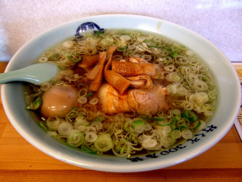 で、丸信ラーメンに行くと「丸特」(背脂が載った、いわゆる「こってり」のほう。)を頼むことが多いのですが、お品書きを見ると見あたらないので、味玉ラーメンを中盛で注文しました。それで丸信っぽくネギがたくさん浮かぶスープは、油がほとんど浮いておらず、ものすごくあっさりしてますねぇ。それに固めの平打ち縮れ麺が合わさり、四角いチャーシューは、柔らかいけど、丸新ラーメンのようなとろけるタイプではなく歯ごたえがあるもの。あと味玉は半熟で、結構しっかり味が付いてました。