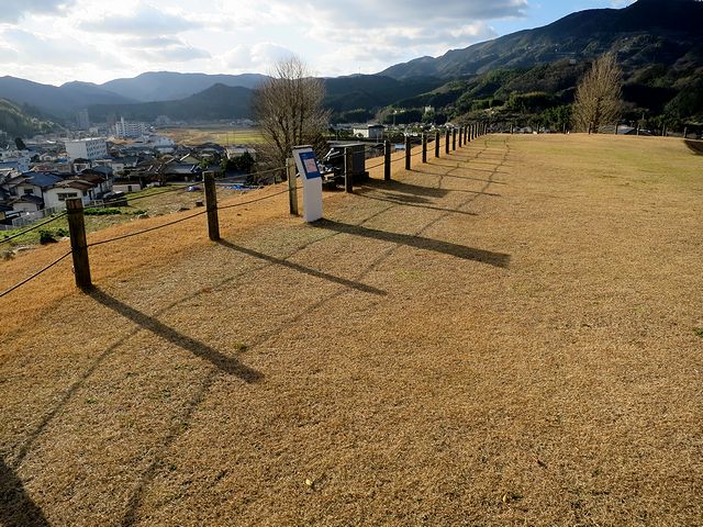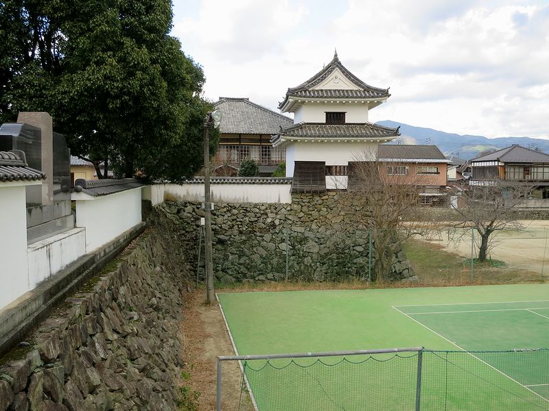 それで最初に向かったのが、駐車場から南東方向にある、国重文の三の丸南隅櫓。櫓の達所はポケットパーク的に整備され、「お殿様公園」という愛称が付けられていたのですが、これは公園内の、旧大洲藩主加藤家が大正14年に建てた住宅(とそれをロケで使用した『男はつらいよ 寅次郎と殿様』)に由来するようで。で、櫓自体はかなりコンパクトなのですが、公園を出て大洲高校のあたりから外堀の跡(高校のテニスコートになっていました)ごしに見ると、これが何とも良い感じで、往時の佇まいを偲ぶことが出来ました。