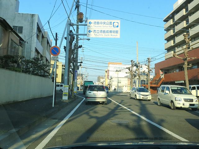 四国中央市の宿を出発し、高速道路をひたすら西進。途中、徳島道吉野川SAで朝食をいただきつつ、徳島ICで高速を降りた後は国道11号で吉野川を渡って徳島の市街地へ。程なく、案内看板も現れ、わりとスムースにお城のある徳島中央公園の東側駐車場に到着しました。