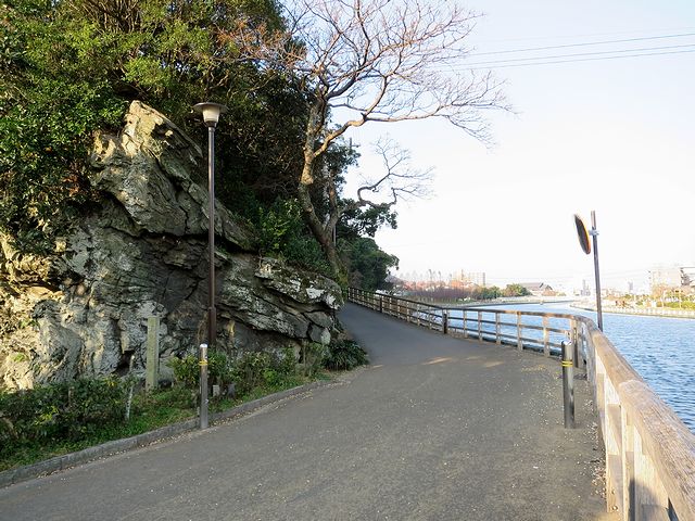 それで駐車場にレンタカーを置いて早速登城といきたいところなのですが、その前にこちらを。駐車場というかお城のある城山のすぐ北側に流れているのが、かつてお城の堀代わりだった助任(すけとう)川。また、そこに接する城山の外縁部の岩肌には、縄文時代早~前期である約5000~6000千年前、ここが海だった事を示す海蝕痕が残っています。また、当地は昔から人跡の有った所らしく、この城山には縄文時代後~晩期の約4000~2300千年前ものと見られる貝塚が見つかったそうで。