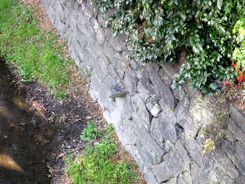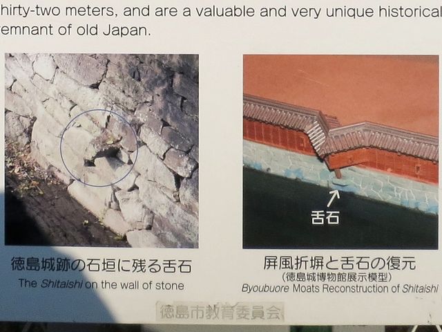 大手門から入って太鼓櫓方面に進むと跨線橋でJR徳島線を跨ぐのですが、そのJR徳島線の線路が敷かれているところは、城の南側の堀代わりであった寺島川だったそうです。(お城側にほんの少しだけ水路っぽいものが残っていましたが。)それで寺島川に沿って石垣を積み、その上には塀がかけられていたのですが、現在も残る石垣の所々には、屏風折塀の突出部を支えた舌石という石もありました。