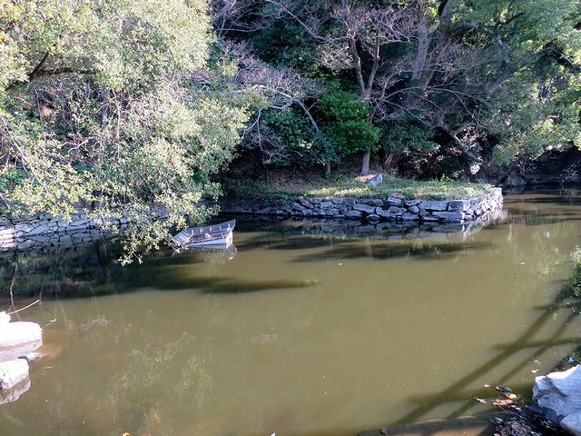それらを見つつ南下すると、立派な堀と石垣が現れました。ここまで、いかにもな遺構にはお目に掛かっていなかったので、「おお!」と一気にテンションが。ちなみに、徳島城の石垣に使われている石材は、一見緑がかっているものが多いのですが、主に市内にある眉山の三波川変成岩(緑泥石片岩)が使われているとのこと。またこの堀の水は汽水(淡水と海水が混ざり合った水)らしく、コノシロやボラ、チヌにマハゼ、ウナギにスズキなど、汽水域に生息する魚が生息しているそうです。(実際に魚影は見かけたけど、何の魚は特定できませんでした…。)