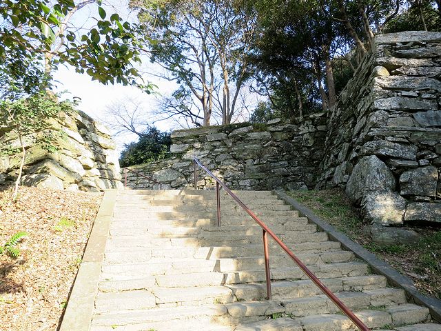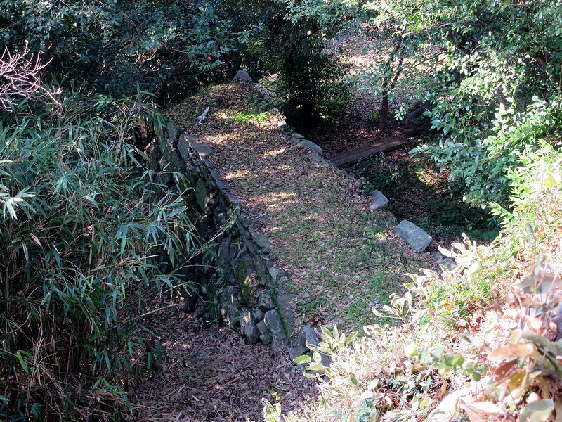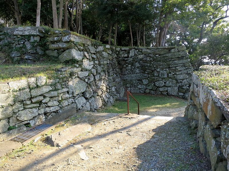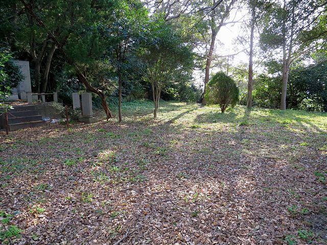 そしてとうとうやって来た本丸跡。結構な広さですね。で、当然のことながらここが城山の一番高いところで、標高は61.7m(麓の案内板より)。また、本丸と呼ばれるだけあって、元々はここに天守が在ったそうなのですが、元和年間(1615~1624年)には取り壊されてしまったそうで。それと、本丸から下方向を見た時に登り石垣らしい遺構を発見したのですが、特に説明板とか無かったので、実際に何なのかはわかりませんでした。(もう少しお城を見るスキルを上げなきゃ駄目ですね…。)