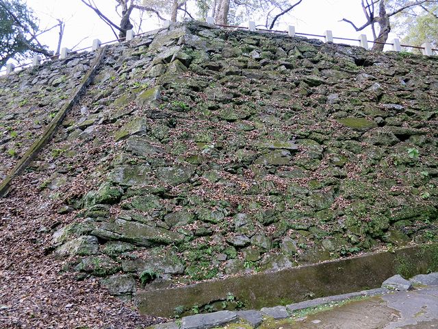 西坂口から階段をヒーコラ言いながら登ると、西三の丸に到着。この付近より本丸にかけて、先述の三波川変成岩(緑泥石片岩)が使用された石垣が連続で現れ、結構な見応えです。また三の丸の西側部分は水道施設の城山配水池を作る際一部取り壊されてしまったとのことで。それにしても、市街地にある平山城は、必ずと言って良い程水道の配水池が有りますね。(極めて合理的選択だと思いますが。)