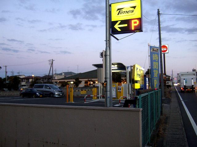 というわけで、前述のとおり千葉県道180号を北方十字路目指して進んできたところ、その手前に、「Times24h」の看板を発見。通り過ぎざまに「1日 平日300円 土・日・祝日1200円」と書かれてあったのが見えたので、北方十字路で一度曲がってからUターン。JRAの駐車場だと、確か、料金が1日2000円だったと思うのですが今日(平成23年1月5日)は幸いなことに平日なので、1日300円で停めることができました。ちなみに、その駐車場の名前は『タイムズ市川北方町』。午前6時38分頃に到着した時はガラガラというか、先客は1台のみでした。