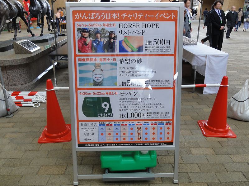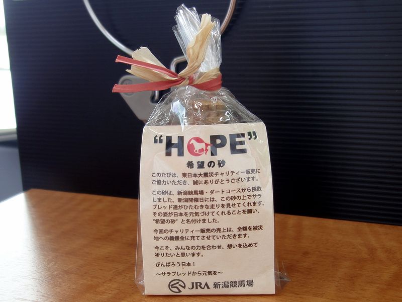 この日は、東日本大震災関連の『がんばろう日本!チャリティーイベント』として、ダートコースの砂を『希望の砂』と称して販売していました。(他のチャリティー販売は、残念ながらこの日はなし。)あと、新潟競馬場と言えば、日本の平地競争で唯一行われる1,000mの直線競馬。この日は第5レースの未勝利戦として行われたのですが、外ラチ沿いを疾走する競走馬は、未勝利戦でもやっぱり良いですね。それから、個人的に思い入れのあるスーパージーン号という元競走馬が、まだ誘導馬として頑張っていたのが嬉しいというか、何年か前に福島競馬場に出張してきた時以来の再会で勝手に感動してました。