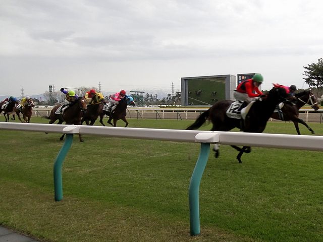 【直線競馬で外ラチ沿いを疾走する競走馬】