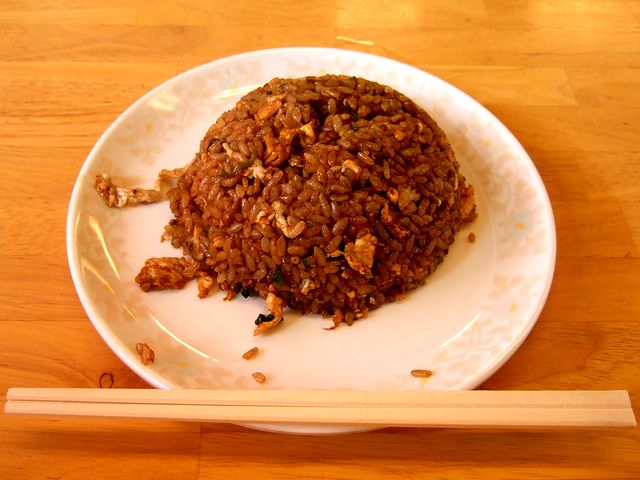 オーダーして程なく、まず、ヤキメシから登場しましたが、ソレは見た目が、「く、黒い!」ご飯をソースで炒めたような色ですが、漂ってくるのは、とても香ばしい醤油の焦げた香り。早速いただいてみると、香ばしい香りが更に強く感じられ、また、醤油のアミノ酸的な旨味が口の中に広がりました。でも、見た目ほど塩分が強いわけではなく、醤油のカドも感じられません。いやぁ、これは旨いですよ。