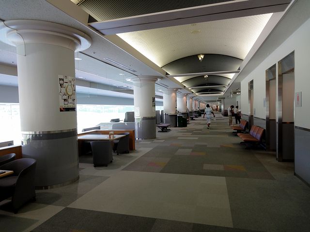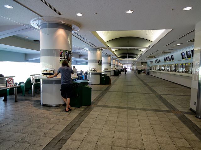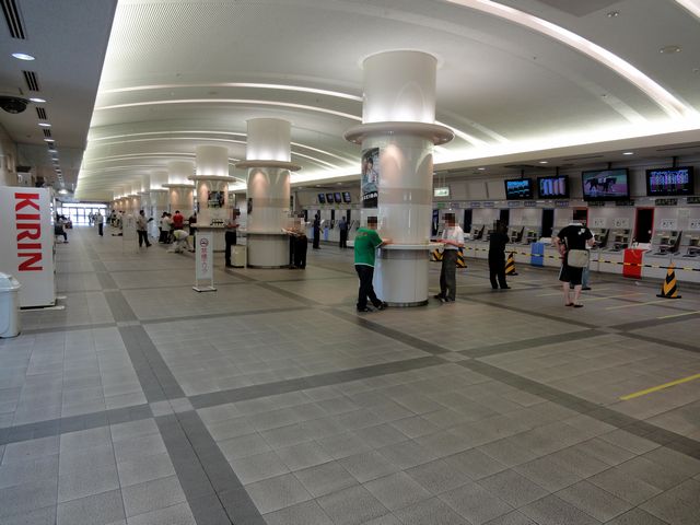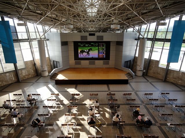 正面入口の馬象の背後がこちら。正面には大型モニターとステージが、また背後にはお姉さんの常駐する案内所と、専門誌の自販機、そして売店などが。ちなみに、前売り及び他場の馬券はこの背後の券売機のみの発売だったかと。また、場外発売時はここがメインになるそうです。