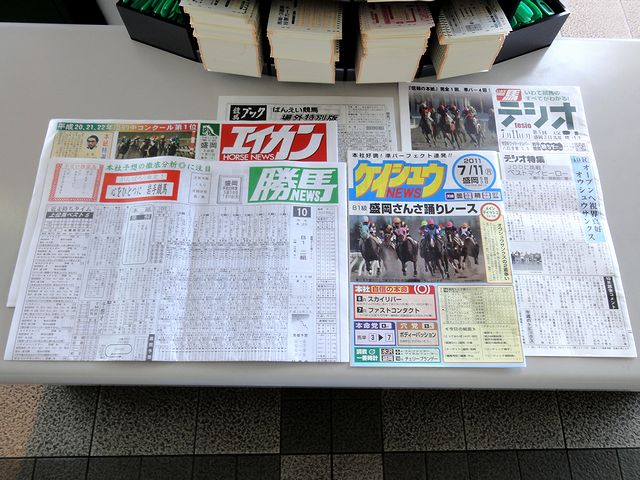 岩手競馬には、いわて馬テシオ、HORSE NEWS エイカン、勝馬、ケイシュウNEWSの4誌が(って、全部買ってしまった…。)。トラディショナルな新聞タイプから、テシオ、ケイシュウのようなブックタイプまで。あと、競馬ブックはこの日場外発売だったばんえい3Rのみ掲載で、専門誌を買うと謎の予想誌(紙?)と共にいただけました。