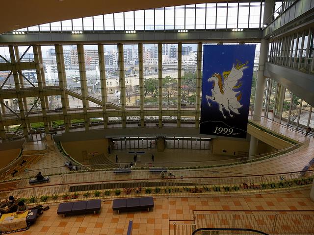 スタンドのメインエントランスから入って右手方面には、プラザ99と名付けられたイベントスペース的な空間が。ちなみに、プラザ99の99は、小倉競馬場がリニューアルした1999年に因んでいるそうで。あと、こちらには、当地出身の漫画家、松本零士先生が描かれたイラストを使った巨大な垂れ幕が掛かっています。