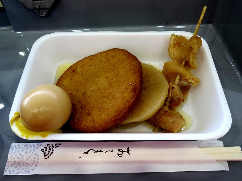 こちらは、うどんの後で購入し、自席まで持ち帰ってビールと共にいただいたもの。朝イチにもかかわらず、ちゃんと味が染みてます。あと、地域差やお店ごとの差が意外にあるおでんの味付けですが、北関東人の私がいただいても違和感ないというか、美味しくいただける味付けでした。