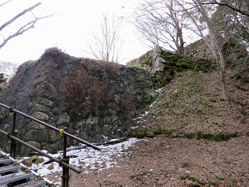 津和野城には、丁度お昼頃に到着。早速、今回の旅程を組む上でポイントの1つとなった観光リフトで上に登り、そこからちょっと歩いて城跡へと向かったのですが、これが何というか、石垣と曲輪の遺構が大変素晴らしいっ!!天気がハッキリしないので眺め的にはちょっと残念だったのですが、にもかかわらず、逆に雪の残る城跡は何とも良い雰囲気です。もっとも、相方には先程来痛む足で、足下の悪い場所に付き合わせて申し訳ないのですが。