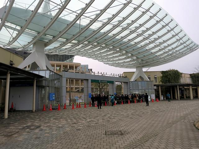 【小倉競馬場正門と入場を待つ人達】