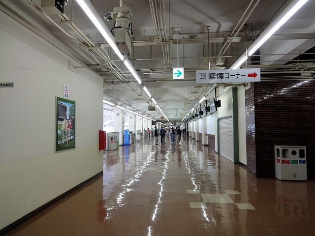 こちらは今回座らなかったB指定席とC指定席。写真だけ撮らせて貰いました。ちなみに、B指定席はターフビジョン前で1人500円(入場料込み)、C指定席は4角寄りで1人300円(入場料込み)となっているのですが、2人掛け席はA指定席と違って両側通路の席もあるし、最前列に座ればカウンターがあるので、(おしりが痛くなりそうなのを除けば)こちらの方が良かったかも知れません。
