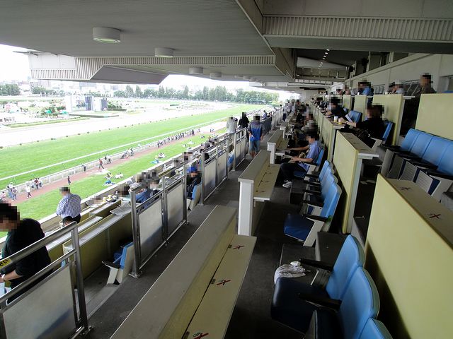 今回座ったのがこちらのA指定席。2人掛け(元々は5人掛けの席の真ん中の席を撤去した物?)と4人掛けの席、そしてテーブルではなく狭いカウンターのみで、コンセントはおろかモニターもないというところが、昔ながらの競馬場という感じです。もっともその分料金は安く、入場料込みで1人1,000円なのですが。それにしても、隣の二人組のオッサン達。二人揃ってちょくちょく自席を離れるのですが、マークカードの束をそのままカウンター上に置きっぱなしで行くので、そのカードが風でこちらの方に飛ばされ、えらい迷惑でした。