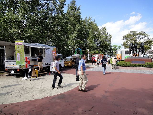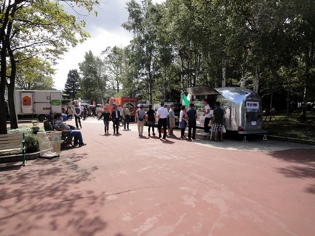 入口からパドックにかけての間は、キッチンカーが多数出ていました。また、そのあたりの奥に向かって左手には、しらかば公園があります。