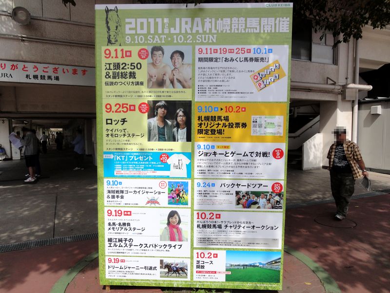 それで今回の元々の話が、9月11日(平成23年)に札幌でちょっとした用事があって旅行の計画を立てることになったのですが、その時気がついたが、丁度その時期は札幌競馬が開催されているではないですか!実は、昨年も所用で札幌に行った際、札幌競馬が開催していたにもかかわらず諸々の事情で行きっぱぐってしまっていたので、「今年こそは」と、所用の前日である9月10日(土)にお伺いしてきました。
