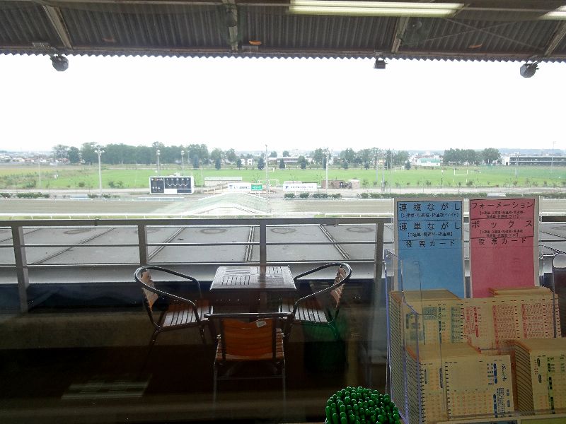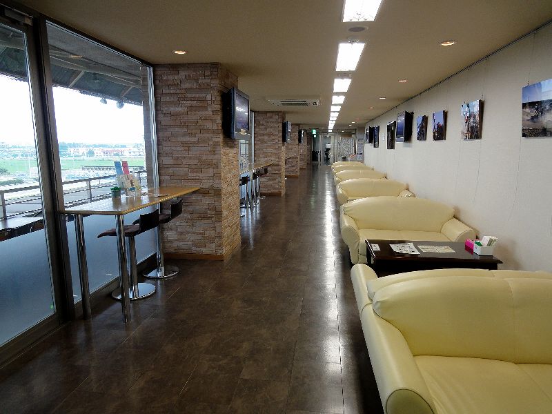 メインスタンド3階には、1人1,000円の料金で利用できるプレミアムラウンジがあります。もっとも、1,000円といっても、料金を払う際に4枚綴りの『選択チケット』というのがもらえ、例えば、2枚で缶ビール(350ml)1本や3枚で専門紙1部などと交換できるようになっていて、実質500円以下でしょうか。で、エレベーターがないのでコース脇やパドックと行ったり来たりするのには少々つらいかもしれませんが、高所からの眺めはなかなか。設備面では、走路に面したほうにカウンター席とその反対側に4人掛けのソファー席(禁煙)、そして外にはテラス席(喫煙可)があり、また他にも喫煙室や、専用の自動発売・払戻機、1杯50円で購入できるソフトドリンクの自販機が設置されていました。ちなみに、夜間のレース時は室内の照明が減光され、室内(と言ってもカウンター席からになってしまいますが)からレースが見やすくなるよう配慮してくれますが、これが結構ロマンチックでしたね。