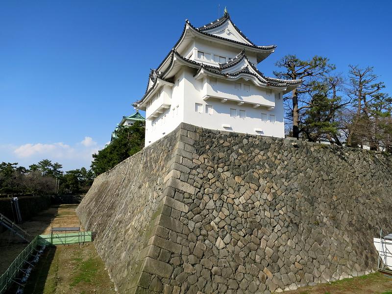 で、関ヶ原の戦いの後、大阪城の豊臣秀頼に備えて、徳川家康が各地の要衝に天下普請で城を築いていくのですが、その際に目を付けたのが那古野。当時の尾張国の拠点で、家康の9男にして清洲藩主である徳川義直の居城でもあった清洲城は、手狭だったことや度々水害に見舞われていることなどから、新しく城を築くことを決めたのですが、いくつかの候補の中から当地に築城が決定。慶長14年(1609年)にそのお触れが出されました。で、天下普請により、関ヶ原の戦いの後は西国に飛ばされていた豊臣恩顧の大名が多数動員され、慶長15年(1610年)に築城が開始。わずか1年足らずで巨大な規模の石垣が完成したのですが、その際、「駿府や江戸ならともかく、何で妾の子の城まで。」と文句を言う福島正則を「滅多なことを言うものではない。嫌ならさっさと帰国して謀反の支度でもしろ。それが出来ないならキリキリ働け。」とたしなめたエピソードは有名ですね。また築城と併せて城下町の整備も行われ、元々清洲城下に住んでいた家臣や町人、城下の寺社仏閣、はては清洲城小天守まで移す「清洲越し」と称された大規模な引っ越しが行われました。それで、義直自身は元和2年(1616年)に名古屋城に移り、以降、尾張徳川家の居城として幕末を迎えました。