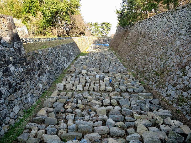 現在名古屋城では、本丸御殿復元工事の他、本丸搦手馬出周辺の石垣修復工事も行われているのですが、その際、一度バラされてた石垣の石が、本丸の内堀にずらっと並べてありました。