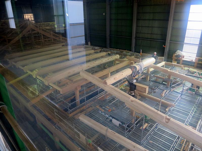 これが今回一番感激というか感動したのが、この、本丸御殿復元工事現場。木造のこれほどまでに巨大な建築物ができあがる様を間近で見られるというのは、宮大工でもない限り、なかなか出来ない体験です。ですが、こちらにたどり着いたのが見学可能な時間ギリギリだったので、見学が駆け足になってしまったのは、本当に勿体なかったというか。