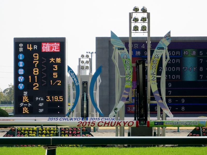 今開催最終日がG1高松宮記念なので、芝の方はそれ仕様になっていたゴール板。また、その後方の着順掲示板、ターフビジョンは、JRAの競馬場で一般的なものでした。