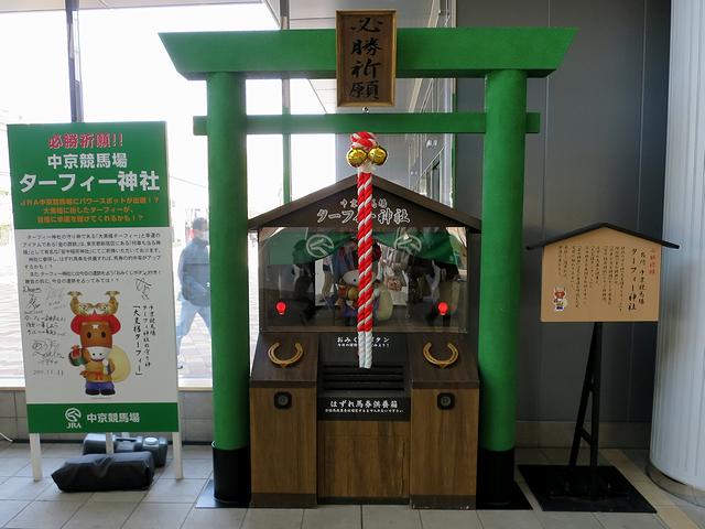 ペガサススタンドの1階にはターフィー神社が。見かけるとつい、参拝というか遊んでしまうんですよね。