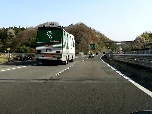というわけでいつもは午前5時頃に自宅を出るところ、今回は6時半過ぎに出発。もっと遅く出ても午前9時の開場時刻には間に合う(自宅から福島競馬場まで、スムースなら1時間50分程度)のですが、駐車場が近いところに停められるかどうか判らなかったので、微妙なこの時刻に。最寄りのICそれでから東北道に乗り、あとは福島西ICまで東北道を北上するのですが、その道中は、桜がとてもきれいでした。また途中、馬運車を見かけてテンションアップ!競馬をやるようになって以来、何故か馬運車を見つけるとテンションが上がるようになってしまったのですが、特に特に日本馬匹さんのクルマは1台1台に歴代の名馬の名前が付けられでいて、余計にそれが楽しみ(ちなみにこのクルマはカツラノハイセイコ号でした)だったりします。