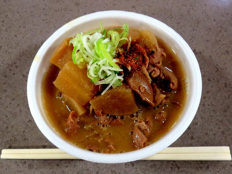 なので、目新しくなくて申し訳ないのですが、これを食べなきゃ福島競馬場に来た気がしないもので。で、毎回書いてますが、あっさりしつつもまろやかな味わいで、とろっと柔らかいモツ、そして心まで味の染みた大根がたまりませぬ。