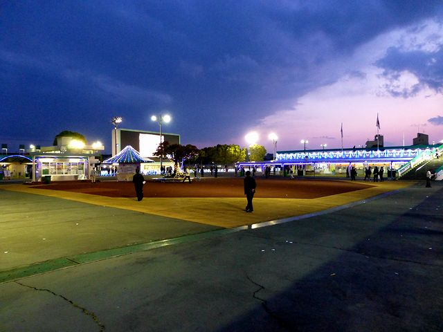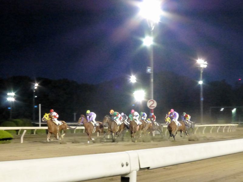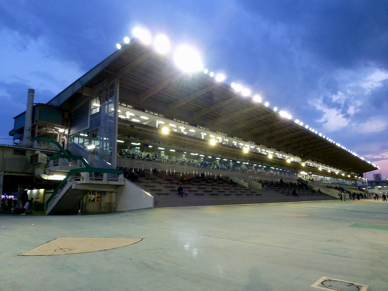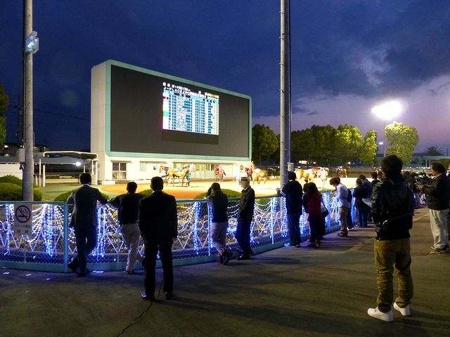 前の記事の冒頭に書いたとおり、今回園田競馬場にお伺いした目的のひとつが、昨年9月から始まった、通称というか愛称『その金ナイター』。今年は、4月から11月までの間、毎週金曜日に実施されます。ちなみに私自身、ナイター競馬というのは一昨年の初秋にお伺いしたばんえい十勝の帯広競馬場以来2回目なのですが、独特の雰囲気があって良いもんですね。特にこちらは金曜日ということで、「花金」(死語?)のルンルン気分(こちらは間違いなく死語)を場内のイルミネーションがさらに盛り上げ、さらには今年度から場内で日替わりでPR活動などをされている『SKNフラッシュ8』というオネーチャン達が華を添え(って、今回は勝負に熱くなりすぎた故あまり自席を動かなかったので会う事はできませんでしたが。)、そんな中、安くて旨い競馬場グルメをつまみつつビール片手のひと勝負なんて最高だと思います。(もっとも、今回はクルマ故飲みませんでしたが。)でもホントに、近くの方がうらやましいというか、もし近くに住んでいるなら、毎週でも通っちゃいそうです。