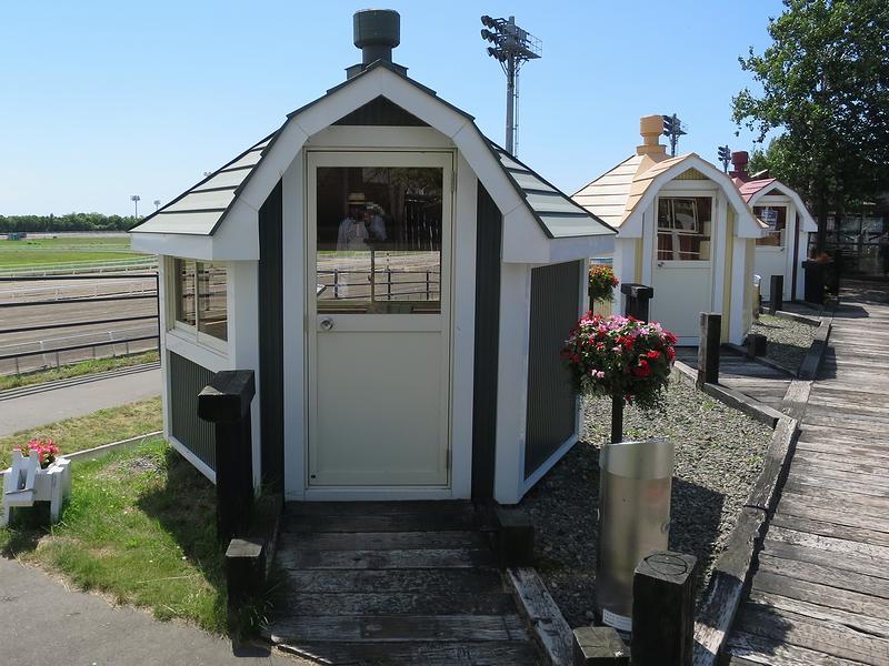 中はこんな感じ。2人で貸し切るには若干贅沢というか、グループでも全然大丈夫な広さ(最大10人まで可とのこと。)です。またコースは最終コーナーから最後の直線部分が見えるのですが、室内にはモニターも備え付けられているので、ゴール前の様子やオッズもちゃんと見ることができます。で、椅子は簡易なものなので座り心地うんぬんを言うのは野暮ってものですが、中に入ってしまえば外界とは基本的に隔離されるので、とても快適に過ごすことができました。