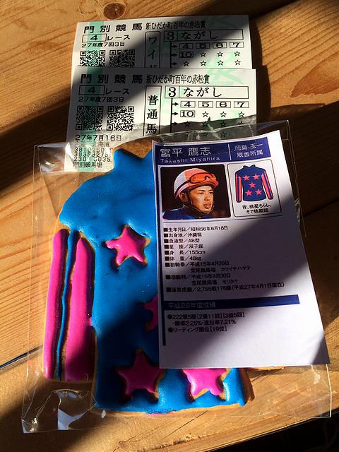 そんな宮平騎手なのですが、何とこの日の第4レースで勝利し、早くも昨年の勝利数を上回ることができました!おまけに宮平騎手の騎乗馬から流していた馬券もわりと付いたので、もう!あと、一緒に映っている勝負服クッキーは、後述するパティスリー・パサパさんで購入(1個350円)したものです。
