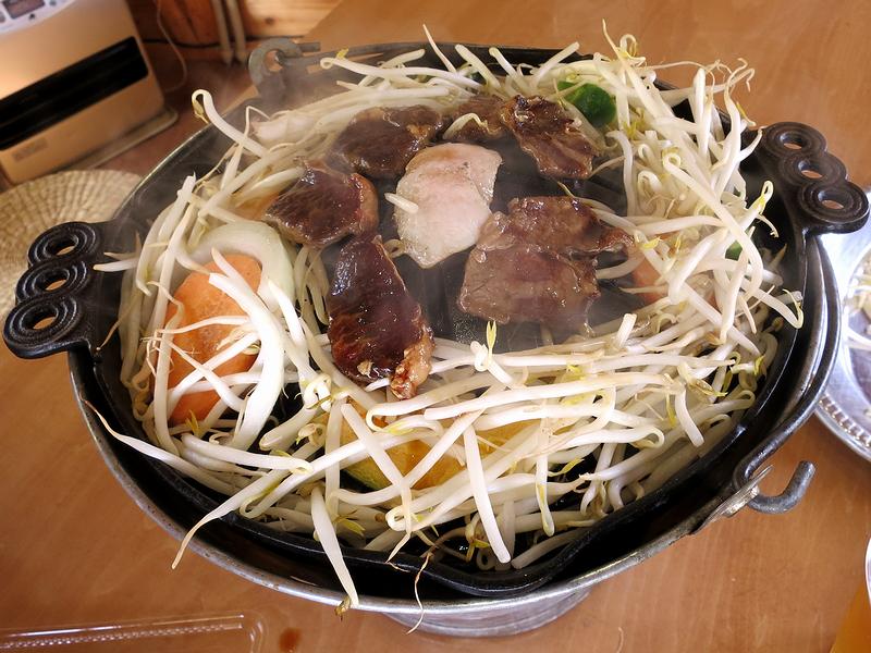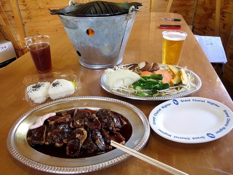それと今回は、8名用のグリルハウスを2人で借りました。ちなみに、人数が多いというか団体の場合は、約30名収容のジンギスカンハウス、約50名収容のサマーハウス、とねっこデッキというのもあるのですが、この日も、団体さんやイベント的なものが入っていて、受付というか盛り付けしたりする小屋は、大変忙しそうでした。それでその団体さんを見て、当地では仕事帰りにネクタイ姿でもジンギスカンをいっちゃってるのに少々驚いたというか。(ネクタイやスラックスに臭いが付いてしまっても大丈夫なんですかね、などと余計な心配をしてしまいました。)