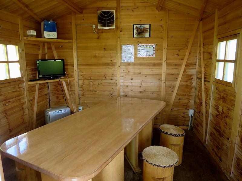 これがそのプチハウスなのですが、写真で一番手前の棟を借りることができました。で、入口のガラスに変な人が映ってしまっている(人相風体を気にしてはいけません)のですが、それは内側にロール式のカーテンが備え付けてあるおかげで、そこから中を覗かれる心配はありません。(もっとも、たまに遠慮の無い子供がコース側の窓から中を覗いたりしますが。)